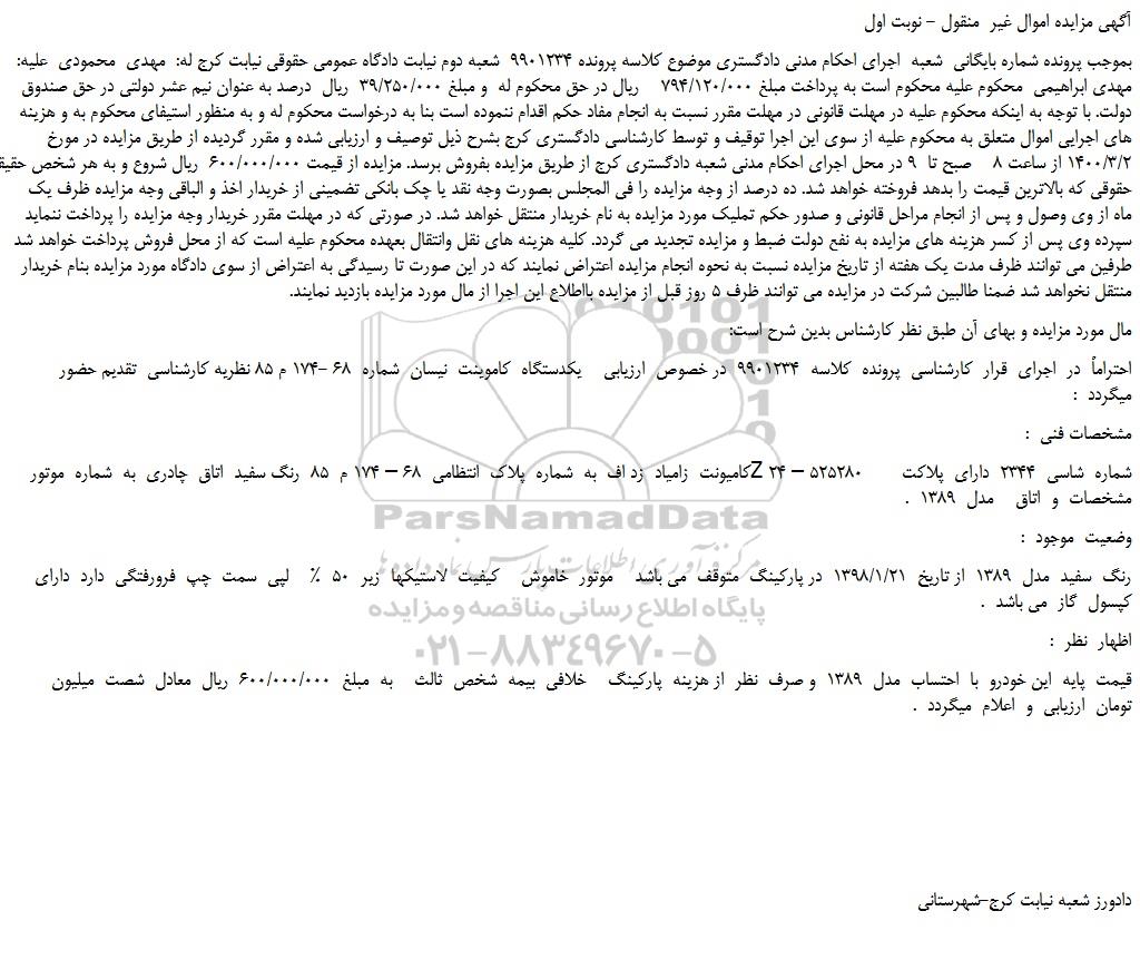 بموجب پرونده شماره بایگانی شعبه اجرای احکام مدنی دادگستری موضوع کلاسه پرونده 9901234 شعبه دوم نیابت دادگاه عمومی حقوقی نیابت کرج له: مهدی محمودی علیه: مهدی ابراهیمی محکوم علیه محکوم است به پرداخت مبلغ 794/120/000 ریال در حق محکوم له و مبلغ 39/250/000 ریال درصد به عنوان نیم عشر دولتی در حق صندوق دولت. با توجه به اینکه محکوم علیه در مهلت قانونی در مهلت مقرر نسبت به انجام مفاد حکم اقدام ننموده است بنا به درخواست محکوم له و به منظور استیفای محکوم به و هزینه های اجرایی اموال متعلق به محکوم علیه از سوی این اجرا توقیف و توسط کارشناسی دادگستری کرج بشرح ذیل توصیف و ارزیابی شده و مقرر گردیده از طریق مزایده در مورخ 1400/3/2 از ساعت 8 صبح تا 9 در محل اجرای احکام مدنی شعبه دادگستری کرج از طریق مزایده بفروش برسد. مزایده از قیمت 600/000/000 ریال شروع و به هر شخص حقیقی و حقوقی که بالاترین قیمت را بدهد فروخته خواهد شد. ده درصد از وجه مزایده را فی المجلس بصورت وجه نقد یا چک بانکی تضمینی از خریدار اخذ و الباقی وجه مزایده ظرف یک ماه از وی وصول و پس از انجام مراحل قانونی و صدور حکم تملیک مورد مزایده به نام خریدار منتقل خواهد شد. در صورتی که در مهلت مقرر خریدار وجه مزایده را پرداخت ننماید سپرده وی پس از کسر هزینه های مزایده به نفع دولت ضبط و مزایده تجدید می گردد. کلیه هزینه های نقل وانتقال بعهده محکوم علیه است که از محل فروش پرداخت خواهد شد طرفین می توانند ظرف مدت یک هفته از تاریخ مزایده نسبت به نحوه انجام مزایده اعتراض نمایند که در این صورت تا رسیدگی به اعتراض از سوی دادگاه مورد مزایده بنام خریدار منتقل نخواهد شد ضمنا طالبین شرکت در مزایده می توانند ظرف 5 روز قبل از مزایده بااطلاع این اجرا از مال مورد مزایده بازدید نمایند.
