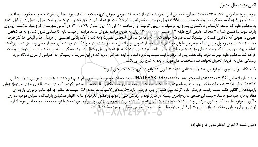 بموجب پرونده اجرایی کلاسه 6/9900024 مطروحه در این اجرا، اجراییه صادره از شعبه 16 عمومی حقوقی کرج محکوم له :خانم پروانه مظفری فرزند منصور محکوم علیه آقای مجید اکبری فرزنداحمد محکوم به پرداخت مبلغ 1134680000ریال در حق محکوم له و مبلع 5% بابت هزینه اجرایی در حق صندوق دولت،مقرر است اموال منقول بشرح ذیل متعلق به محکوم علیه که توسط کارشناس دادگستری بشرح زیر توصیف و ارزیابی گردیده و از ساعت 10 الی 11 روز مورخ 1400/2/29 در آدرس شهرستان کرج بلوار ملاصدرا روبروی پارک نبوت ساختمان شماره 2 محاکم حقوقی کرج طبقه 3 از قیمت 1300000000 ریال به طریق مزایده بفروش برسد مزایده از قیمت پایه کارشناسی شروع شده و به هر شخص حقیقی و حقوقی که بالاترین قیمت را پیشنهاد نماید فروخته خواهد شد 10% وجه مزایده فی المجلس بصورت وجه نقد یا چک بانکی تضمینی از خریدار اخذ و الباقی حداکثر ظرف مهلت 2 هفته از وی وصول و پس از انجام مراحل قانونی مورد مزایده به خریدار تحویل و و انتقال سند خواهد شد در صورتیکه در مهلت مقرر،خریدار مابقی وجه مزایده را پرداخت ننماید سپرده وی پس از کسر هزینه های مزایده بنفع دولت ضبط و مزایده تجدید می گردد.کلیه هزینه های نقل وانتقال به عهده محکوم علیه می باشد و از محل فروش پرداخت خواهد شد .محکوم علیه میتواند ظرف یک هفته پس از انجام مزایده نسبت به نحوه انجام مزایده اعتراض نماید که در این صورت تا رسیدگی به اعتراض از سوی دادگاه مورد رسیدگی ،مال به خریدار تحویل نخواهد شد.مشخصات مال مورد مزایده به شرح زیر می باشد.