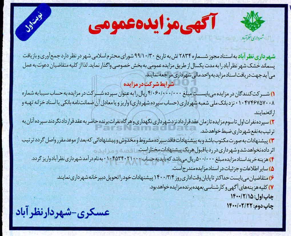 مزایده عمومی مزایده جمع آوری و بازیافت پسماند خشک برگزار میگردد. از کلیه افراد متخصص و شرکتهای واجد شرایط دعوت به عمل میآید تا در این مزایده با کد خبرگزاری پارس نماد : 3382108 شرکت نمایند تاریخ شروع مزایده : 1400/02/15 مهلت شرکت در مزایده: تا پایان روز 1400/03/04 مکان برگزاری اموال واگذاری استانهای البرز و دستهبندیهای مربوط به این حراجی بازیافت میباشد.