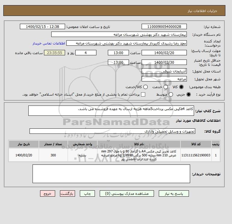 شرح کلی نیاز: کاغذ a4کپی مکس پرداخت5ماهه هزینه ارسال به عهده فروشنده می باشد.
