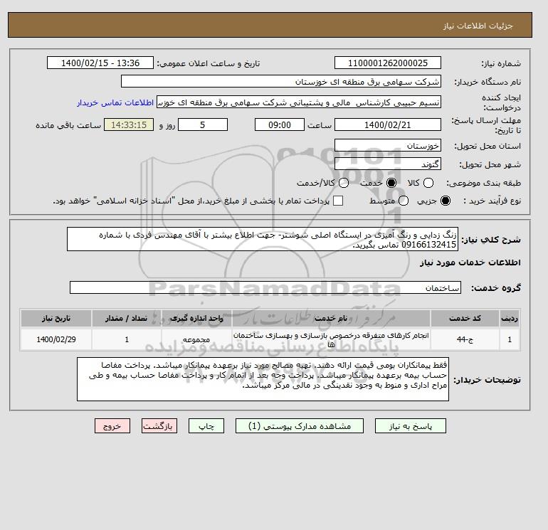 شرح کلی نیاز: زنگ زدایی و رنگ آمیزی در ایستگاه اصلی شوشتر- جهت اطلاع بیشتر با آقای مهندس فردی با شماره 09166132415 تماس بگیرید.