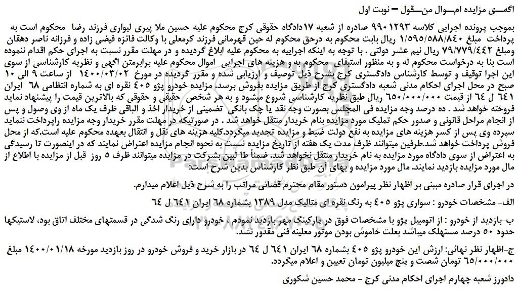 بموجب پرونده اجرایی کلاسه 9901293 صادره از شعبه 17دادگاه حقوقی کرج محکوم علیه حسین ملا پیری لیواری فرزند رضا  محکوم است به پرداخت  مبلغ 1/595/588/840 ریال بابت محکوم به درحق محکوم له حین قهرمانی فرزند کرمعلی با وکالت فائزه فیضی زاده و فرزانه ناصر دهقان  ومبلغ 79/779/442 ریال نیم عشر دولتی . با توجه به اینکه اجراییه به محکوم علیه ابلاغ گردیده و در مهلت مقرر نسبت به اجرای حکم اقدام ننموده است بنا به درخواست محکوم له و به منظور استیفای  محکوم به و هزینه های اجرایی  اموال محکوم علیه برابرمتن اگهی و نظریه کارشناسی از سوی این اجرا توقیف و توسط کارشناس دادگستری کرج بشرح ذیل توصیف و ارزیابی شده و مقرر گردیده در مورخ  1400/03/02  از ساعت 9 الی 10 صبح در محل اجرای احکام مدنی شعبه دادگستری کرج از طریق مزایده بفروش برسد. مزایده خودرو پژو 405 نقره ای به شماره انتظامی 68  ایران 641 ل 64 از قیمت 650/000/000 ریال طبق نظریه کارشناسی شروع میشود و به هر شخص  حقیقی و حقوقی که بالاترین قیمت را پیشنهاد نماید فروخته خواهد شد . ده درصد وجه مزایده فی المجلس بصورت وجه نقد یا چک بانکی  تضمینی از خریدار اخذ و الباقی ظرف یک ماه از وی وصول و پس از انجام مراحل قانونی و صدور حکم تملیک مورد مزایده بنام خریدار منتقل خواهد شد . در صورتیکه در مهلت مقرر خریدار وجه مزایده راپرداخت ننماید سپرده وی پس از کسر هزینه های مزایده به نفع دولت ضبط و مزایده تجدید میگردد.کلیه هزینه های نقل و انتقال بعهده محکوم علیه است.که از محل فروش پرداخت خواهد شد.طرفین میتوانند ظرف مدت یک هفته از تاریخ مزایده نسبت به نحوه انجام مزایده اعتراض نمایند که در اینصورت تا رسیدگی به اعتراض از سوی دادگاه مورد مزایده به نام خریدار منتقل نخواهد شد. ضمناً طا لبین بشرکت در مزایده میتوانند ظرف 5 روز  قبل از مزایده با اطلاع از مال مورد مزایده بازدید نمایند. مال مورد مزایده و بهای آن طبق نظر کارشناس بدین شرح است: