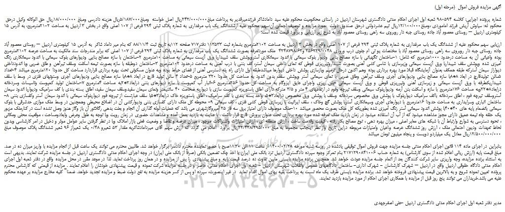 شماره پرونده اجرایی: کلاسه 980594 شعبه اول اجرای احکام مدنی دادگستری شهرستان اردبیل در راستای محکومیت محکوم علیه سید دامادشاکر فرزندمیرقدیر به پرداخت مبلغ242/000/000ریال اصل خواسته ومبلغ5/187/000ریال هزینه دادرسی ومبلغ 18/000/000ریال حق الوکاله وکیل درحق محکوم له: سیاوش آریش فرزند اماموردی ،ومبلغ12/100/000ریال نیم عشردولتی درحق صندوق دولت ،مورد مزایده و توصیف اجمالی آن:سهم محکوم علیه ازششدانگ یک باب مرغداری به شماره پلاک ثبتی 294 فرعی از 107 اصلی واقع در بخش 3 اردبیل به مساحت 2102مترمربع، به آدرس 15 کیلومتری اردبیل – روستای معصوم آباد جاده روستای جبه دار روبروی سه راهی روستای معصوم آباد به شرح زیر ارزیابی و برآورد قیمت شده است؛