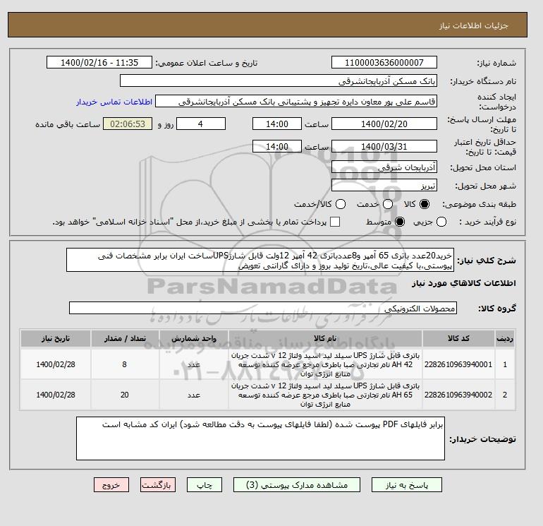 استعلام خرید20عدد باتری 65 آمپر و8عددباتری 42 آمپر 12ولت قابل شارژUPSساخت ایران برابر مشخصات فنی پیوستی،با کیفیت عالی،تاریخ تولید بروز و دارای گارانتی تعویض , استعلام خرید20عدد باتری 65 آمپر و8عددباتری 42 آمپر 12ولت قابل شارژUPSساخت ایران برابر مشخصات فنی پیوستی،با کیفیت عالی،تاریخ تولید بروز و دارای گارانتی تعویض