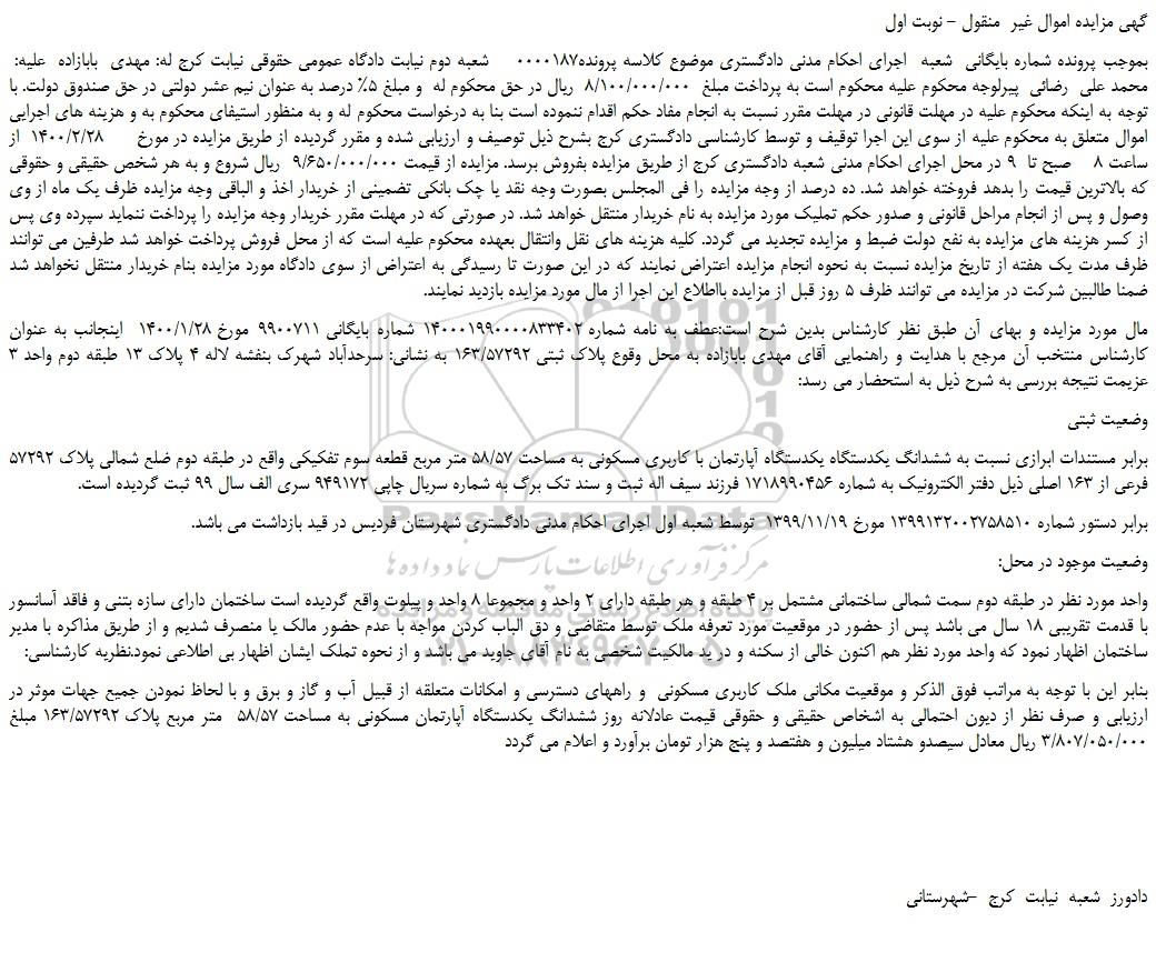 بموجب پرونده شماره بایگانی شعبه اجرای احکام مدنی دادگستری موضوع کلاسه پرونده0000187 شعبه دوم نیابت دادگاه عمومی حقوقی نیابت کرج له: مهدی بابازاده علیه: محمد علی رضائی پیرلوجه محکوم علیه محکوم است به پرداخت مبلغ 8/100/000/000 ریال در حق محکوم له و مبلغ 5% درصد به عنوان نیم عشر دولتی در حق صندوق دولت. با توجه به اینکه محکوم علیه در مهلت قانونی در مهلت مقرر نسبت به انجام مفاد حکم اقدام ننموده است بنا به درخواست محکوم له و به منظور استیفای محکوم به و هزینه های اجرایی اموال متعلق به محکوم علیه از سوی این اجرا توقیف و توسط کارشناسی دادگستری کرج بشرح ذیل توصیف و ارزیابی شده و مقرر گردیده از طریق مزایده در مورخ 1400/2/28 از ساعت 8 صبح تا 9 در محل اجرای احکام مدنی شعبه دادگستری کرج از طریق مزایده بفروش برسد. مزایده از قیمت 9/650/000/000 ریال شروع و به هر شخص حقیقی و حقوقی که بالاترین قیمت را بدهد فروخته خواهد شد. ده درصد از وجه مزایده را فی المجلس بصورت وجه نقد یا چک بانکی تضمینی از خریدار اخذ و الباقی وجه مزایده ظرف یک ماه از وی وصول و پس از انجام مراحل قانونی و صدور حکم تملیک مورد مزایده به نام خریدار منتقل خواهد شد. در صورتی که در مهلت مقرر خریدار وجه مزایده را پرداخت ننماید سپرده وی پس از کسر هزینه های مزایده به نفع دولت ضبط و مزایده تجدید می گردد. کلیه هزینه های نقل وانتقال بعهده محکوم علیه است که از محل فروش پرداخت خواهد شد طرفین می توانند ظرف مدت یک هفته از تاریخ مزایده نسبت به نحوه انجام مزایده اعتراض نمایند که در این صورت تا رسیدگی به اعتراض از سوی دادگاه مورد مزایده بنام خریدار منتقل نخواهد شد ضمنا طالبین شرکت در مزایده می توانند ظرف 5 روز قبل از مزایده بااطلاع این اجرا از مال مورد مزایده بازدید نمایند.