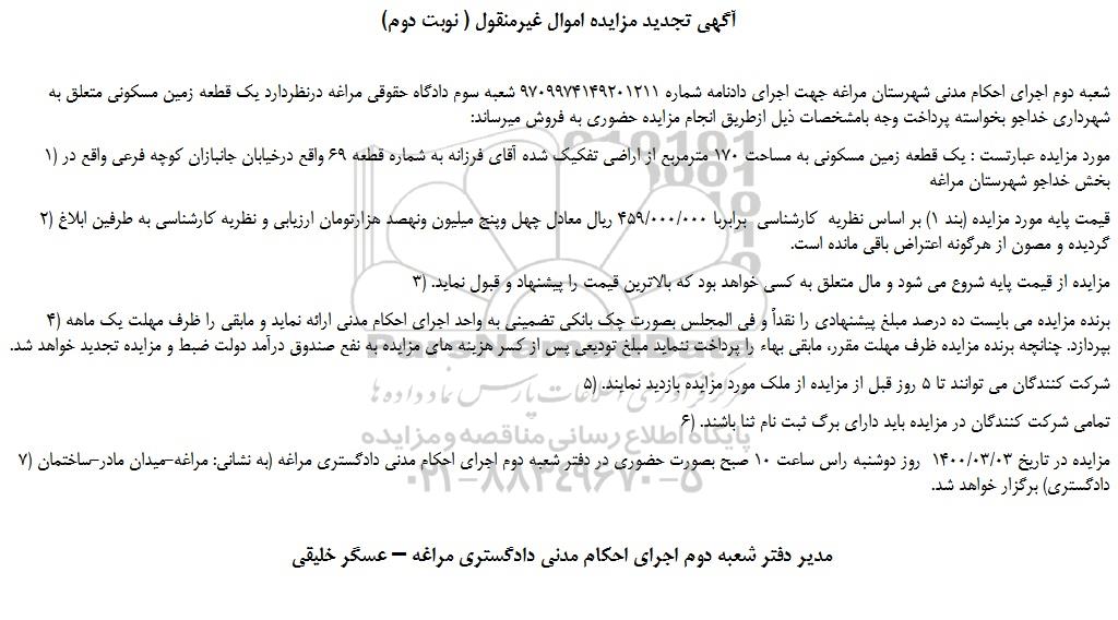 شعبه دوم اجرای احکام مدنی شهرستان مراغه جهت اجرای دادنامه شماره 9709974149201211 شعبه سوم دادگاه حقوقی مراغه درنظردارد یک قطعه زمین مسکونی متعلق به شهرداری خداجو بخواسته پرداخت وجه بامشخصات ذیل ازطریق انجام مزایده حضوری به فروش میرساند: