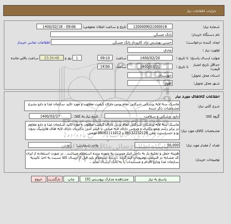 مشخصات کالای مورد نیاز: ماسک سه لایه پزشکی شرکتی تمام پرس دارای کیفیت مطلوب و مورد تائید سازمان غذا و دارو مقاوم در برابر رشد ونمو باکتری و ویروس دارای لایه میانی با فیلتر آنتی باکتریال دارای لایه های هایژنیک بدون بو و حساسیت تلفن 06132232128 و 09161111012 لویمی