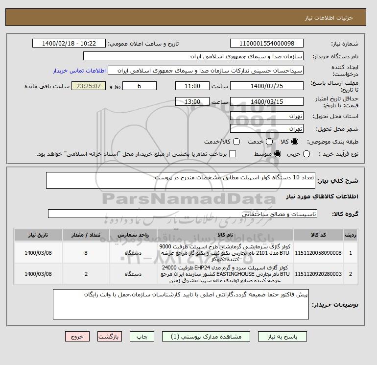 شرح کلی نیاز: تعداد 10 دستگاه کولر اسپیلت مطابق مشخصات مندرج در پیوست