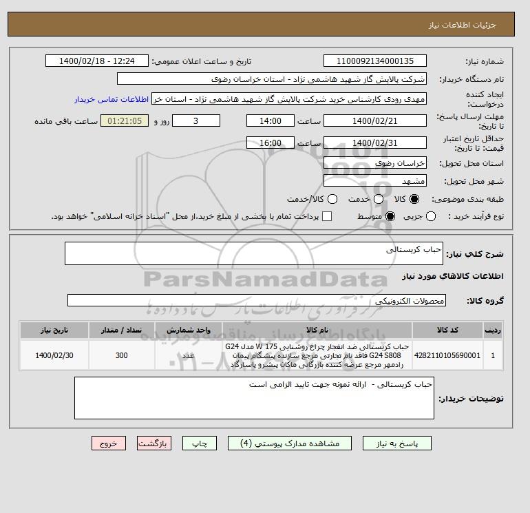نام دستگاه خریدار:شرکت پالایش گاز شهید هاشمی نژاد - استان خراسان رضوی