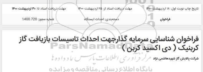 فراخوان شناسایی سرمایه گذار جهت احداث تاسیسات بازیافت گاز کربنیک, فراخوان شناسایی سرمایه گذار جهت احداث تاسیسات بازیافت گاز کربنیک