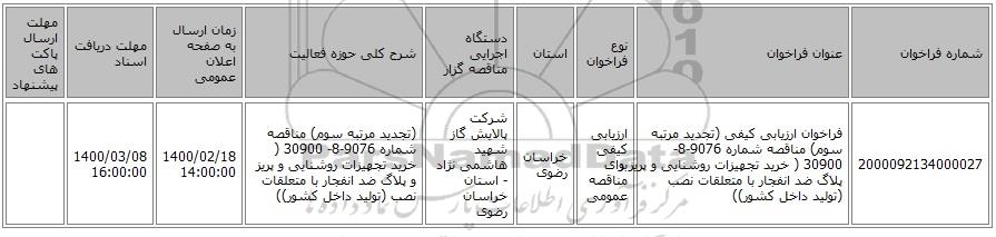 مناقصه، فراخوان ارزیابی کیفی (تجدید مرتبه سوم) مناقصه شماره 9076-8- 30900 ( خرید تجهیزات روشنایی و پریز و پلاگ ضد انفجار با متعلقات نصب (تولید داخل کشور)), فراخوان ارزیابی کیفی (تجدید مرتبه سوم) مناقصه شماره 9076-8- 30900 ( خرید تجهیزات روشنایی و پریز و پلاگ ضد انفجار با متعلقات نصب (تولید داخل کشور))