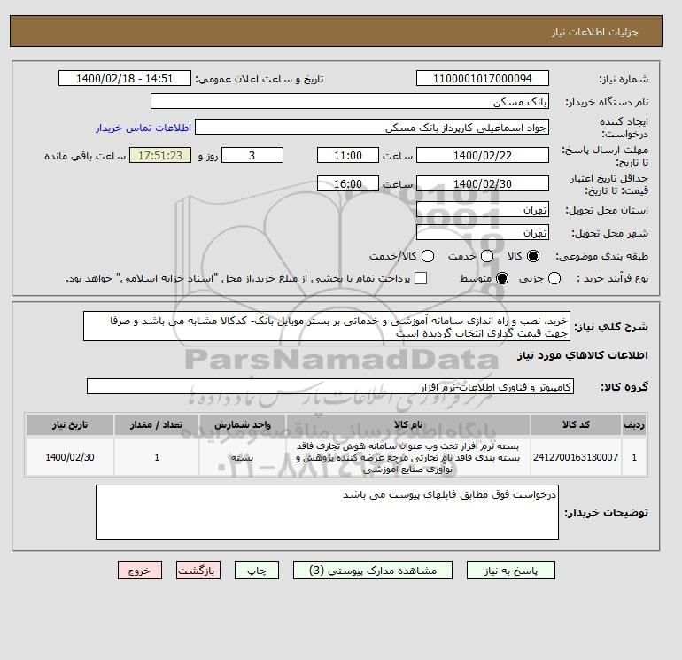 شرح کلی نیاز: خرید، نصب و راه اندازی سامانه آموزشی و خدماتی بر بستر موبایل بانک- کدکالا مشابه می باشد و صرفا جهت قیمت گذاری انتخاب گردیده است