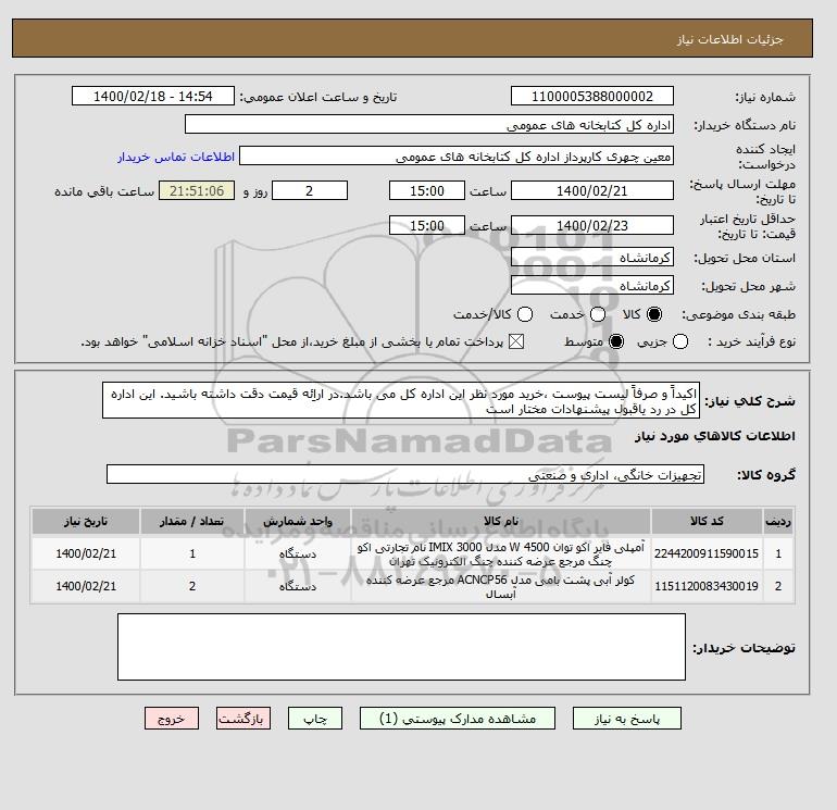 استعلام اکیداً و صرفاً لیست پیوست ،خرید مورد نظر این اداره کل می باشد.در اراِئه قیمت دقت داشته باشید. این اداره کل در رد یاقبول پیشنهادات مختار است, استعلام اکیداً و صرفاً لیست پیوست ،خرید مورد نظر این اداره کل می باشد.در اراِئه قیمت دقت داشته باشید. این اداره کل در رد یاقبول پیشنهادات مختار است