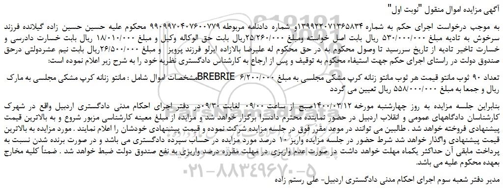 بنابراین جلسه مزایده به روز چهارشنبه مورخه 1400/03/12صبح از ساعت 09/00 لغایت 09/30در دفتر اجرای احکام مدنی دادگستری اردبیل واقع در شهرک کارشناسان دادگاههای عمومی و انقلاب اردبیل در حضور نماینده محترم دادسرا برگزار خواهد شد و مزایده از مبلغ معینه کارشناسی مزبور شروع و به بالاترین قیمت پیشنهادی فروخته خواهد شد . طالبین می توانند در موعد مقرر فوق در جلسه مزایده شرکت نموده و قیمت پیشنهادی خودشان را اعلام نمایند . مورد مزایده به بالاترین قیمت پیشنهادی واگذار خواهد شد شرط حضور در جلسه مزایده واریز 10 درصد مورد مزایده در حساب سپرده دادگستری می باشد و در صورت برنده شدن نسبت به پرداخت مابقی آن حداکثر یکماه مهلت خواهد داشت در صورت عدم واریزی در مهلت مقرره درصد واریزی به نفع صندوق دولت ضبط خواهد شد . ضمناً کلیه مخارج بعهده محکوم علیه می باشد.