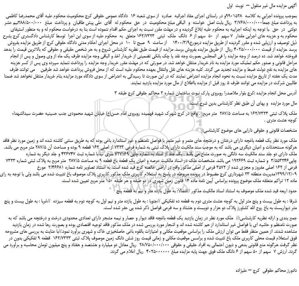 بموجب پرونده اجرایی به کلاسه 9901528و در راستای اجرای مفاد اجرائیه صادره از سوی شعبه 16 دادگاه عمومی حقوقی کرج محکومیت محکوم علیه آقای محمدرضا کاظمی به پرداخت مبلغ جمعاً3/768/000/000 ریال بابت اصل خواسته و الباقی مبلغ محکومیت در حق محکوم له آقای علی پیش طاقیان و پرداخت مبلغ 288/500/000نیم عشر دولتی در حق .با توجه به اینکه اجراییه به محکوم علیه ابلاغ گردیده و در مهلت مقرر نسبت به اجرای حکم اقدام ننموده است بنا به درخواست محکوم له و به منظور استیفای محکوم به و هزینه های اجرایی مقدار 7 سهم از 50 سهم از 6 دانگ ملک ثبتی 162/7323 متعلق به محکوم علیه از سوی این اجرا توسط کارشناس دادگستری کرج بشرح ذیل توصیف و ارزیابی شده و مقرر گردیده از طریق مزایده درمورخ1400/3/9 از ساعت 9 صبح تا 10 در محل اجرای احکام مدنی دادگاه حقوقی کرج از طریق مزایده بفروش برسد .مزایده از قیمت 4025/000/000 ریال از طریق مزایده بفروش برسد. مزایده از قیمت طبق نظریه کارشناس شروع و به هر شخص حقیقی و حقوقی که بالاترین قیمت را بدهد فروخته خواهد شد. ده درصد از وجه مزایده را فی المجلس بصورت وجه نقد یا چک بانکی تضمینی از خریدار اخذ و الباقی وجه مزایده ظرف یک ماه از وی وصول و پس از انجام مراحل قانونی و صدور حکم تملیک مورد مزایده به نام خریدار منتقل خواهد شد. در صورتی که در مهلت مقرر خریدار وجه مزایده را پرداخت ننماید سپرده وی پس از کسر هزینه های مزایده به نفع دولت ضبط و مزایده تجدید می گردد. کلیه هزینه های نقل وانتقال بعهده محکوم علیه است که از محل فروش پرداخت خواهد شد طرفین می توانند ظرف مدت یک هفته از تاریخ مزایده نسبت به نحوه انجام مزایده اعتراض نمایند که در این صورت تا رسیدگی به اعتراض از سوی دادگاه مورد مزایده بنام خریدار منتقل نخواهد شد ضمنا طالبین شرکت در مزایده می توانند ظرف 5 روز قبل از مزایده بااطلاع از مال مورد مزایده بازدید نمایند.