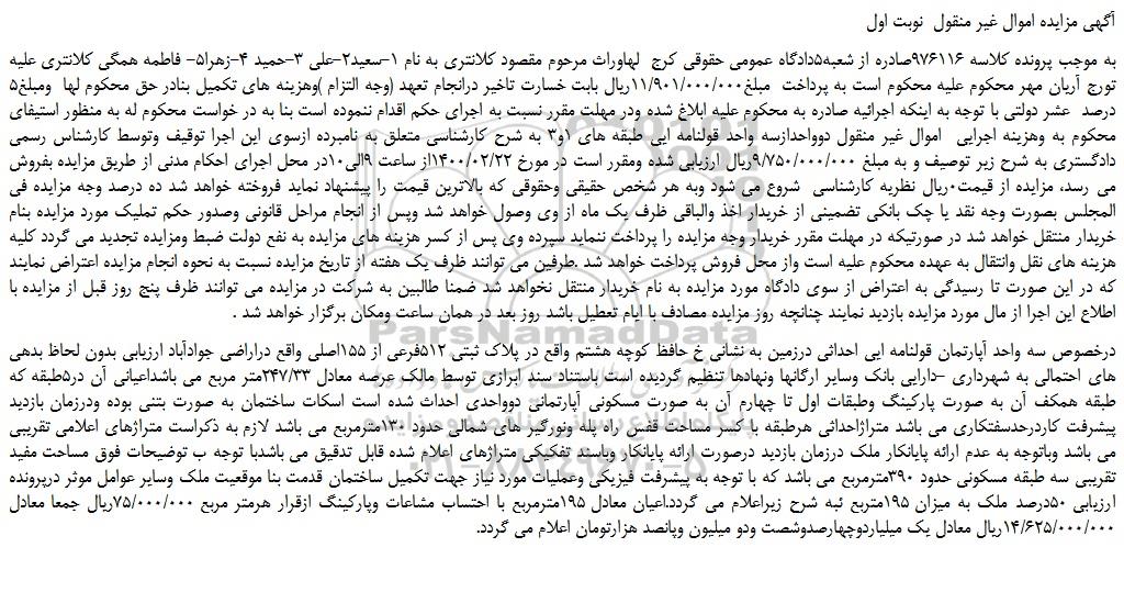 به موجب پرونده کلاسه 976116صادره از شعبه5دادگاه عمومی حقوقی کرج لهاوراث مرحوم مقصود کلانتری به نام 1-سعید2-علی 3-حمید 4-زهرا5- فاطمه همگی کلانتری علیه تورج آریان مهر محکوم علیه محکوم است به پرداخت مبلغ11/901/000/000ریال بابت خسارت تاخیر درانجام تعهد (وجه التزام )وهزینه های تکمیل بنادر حق محکوم لها ومبلغ5 درصد عشر دولتی با توجه به اینکه اجرائیه صادره به محکوم علیه ابلاغ شده ودر مهلت مقرر نسبت به اجرای حکم اقدام ننموده است بنا به در خواست محکوم له به منظور استیفای محکوم به وهزینه اجرایی اموال غیر منقول دوواحدازسه واحد قولنامه ایی طبقه های 1و3 به شرح کارشناسی متعلق به نامبرده ازسوی این اجرا توقیف وتوسط کارشناس رسمی دادگستری به شرح زیر توصیف و به مبلغ 9/750/000/000ریال ارزیابی شده ومقرر است در مورخ 1400/02/22از ساعت 9الی10در محل اجرای احکام مدنی از طریق مزایده بفروش می رسد، مزایده از قیمت0ریال نظریه کارشناسی شروع می شود وبه هر شخص حقیقی وحقوقی که بالاترین قیمت را پیشنهاد نماید فروخته خواهد شد ده درصد وجه مزایده فی المجلس بصورت وجه نقد یا چک بانکی تضمینی از خریدار اخذ والباقی ظرف یک ماه از وی وصول خواهد شد وپس از انجام مراحل قانونی وصدور حکم تملیک مورد مزایده بنام خریدار منتقل خواهد شد در صورتیکه در مهلت مقرر خریدار وجه مزایده را پرداخت ننماید سپرده وی پس از کسر هزینه های مزایده به نفع دولت ضبط ومزایده تجدید می گردد کلیه هزینه های نقل وانتقال به عهده محکوم علیه است واز محل فروش پرداخت خواهد شد .طرفین می توانند ظرف یک هفته از تاریخ مزایده نسبت به نحوه انجام مزایده اعتراض نمایند که در این صورت تا رسیدگی به اعتراض از سوی دادگاه مورد مزایده به نام خریدار منتقل نخواهد شد ضمنا طالبین به شرکت در مزایده می توانند ظرف پنج روز قبل از مزایده با اطلاع این اجرا از مال مورد مزایده بازدید نمایند چنانچه روز مزایده مصادف با ایام تعطیل باشد روز بعد در همان ساعت ومکان برگزار خواهد شد .