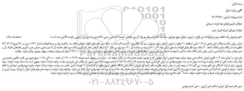 حکم برفروش یک قطعه زمین بایرقولنامه ای واقع در اردبیل، خیابان شیخ جبراییل، سید آباد کلخوران، وتقسیم بهاء آن بین طرفین، توسط کارشناس رسمی دادگستری به شرح ذیل ارزیابی و قیمت گذاری شده است./. مشخصات ملک: