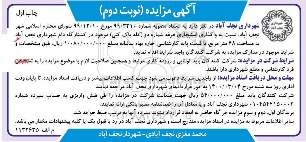 شهرداری نجف آباد در نظر دارد نسبت به واگذاری استیجاری غرفه شماره دو (کله پاک کنی) موجود در کشتارگاه دام شهرداری نجف آباد، به مساحت 48 متر مربع با قیمت پایه کارشناسی اجاره بها سالیانه به مبلغ 1.080.000.000 ریال طبق مشخصات و شرایط موجود در مدارک مزایده به شرکت کنندگان واجد شرایط اقدام نماید.