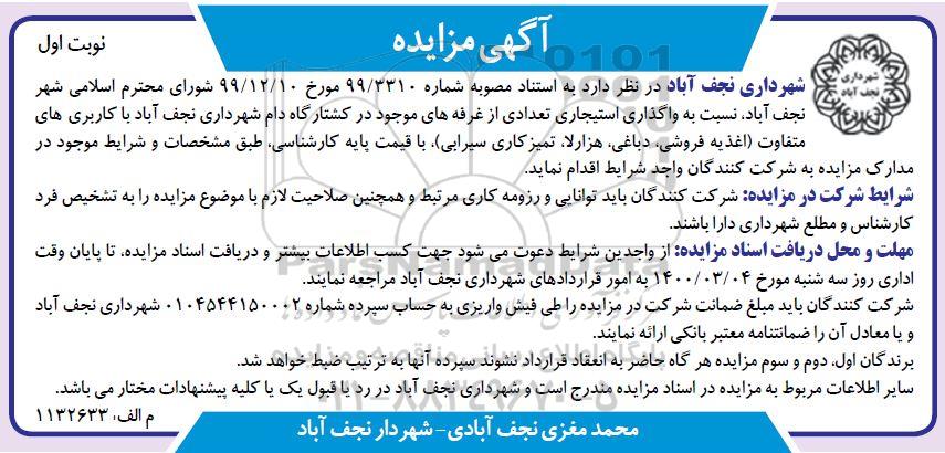 شهرداری نجف آباد در نظر دارد نسبت به واگذاری استیجاری تعدادی از غرفه های موجود در کشتارگاه دام شهرداری نجف اباد با کاربری های متفاوت (اغذیه فروشی ، دباغی ، هزارلا ، تمیزکاری سیرابی) با قیمت پایه کارشناسی طبق مشخصات و شرایط موجود در مدارک مزایده به شرکت کنندگان واجد شرایط اقدام نماید.