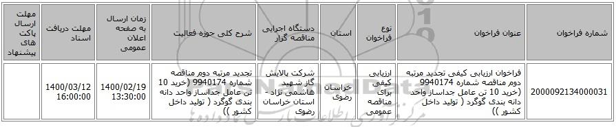 مناقصه، فراخوان ارزیابی کیفی تجدید مرتبه دوم مناقصه شماره 9940174 (خرید 10 تن عامل جداساز واحد دانه بندی گوگرد ( تولید داخل کشور )), فراخوان ارزیابی کیفی تجدید مرتبه دوم مناقصه شماره 9940174 (خرید 10 تن عامل جداساز واحد دانه بندی گوگرد ( تولید داخل کشور ))