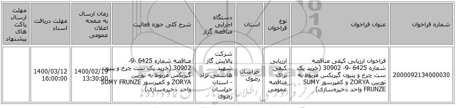 | 2000092134000030 | فراخوان ارزیابی کیفی مناقصه شماره 6425 -9- 30902 (خرید یک ست چرخ و پنیون گیربکس مربوط به توربین ZORYA و کمپرسور SUMY FRUNZE واحد ذخیرهسازی) | ارزیابی کیفی برای مناقصه عمومی | خراسان رضوی | شرکت پالایش گاز شهید هاشمی نژاد - استان خراسان رضوی | مناقصه شماره 6425 -9- 30902 (خرید یک ست چرخ و پنیون گیربکس مربوط به توربین ZORYA و کمپرسور SUMY FRUNZE واحد ذخیرهسازی) | 1400/02/19 13:30:00 | 1400/03/12 16:00:00 |
