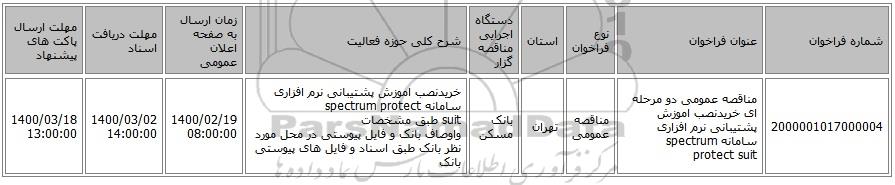 2000001017000004مناقصه عمومی دو مرحله ای خریدنصب اموزش پشتیبانی نرم افزاری سامانه spectrum protect suitمناقصه عمومیتهرانبانک مسکنخریدنصب اموزش پشتیبانی نرم افزاری سامانه spectrum protect suit طبق مشخصات واوصاف بانک و فایل پیوستی در محل مورد نظر بانک طبق اسناد و فایل های پیوستی بانک 1400/02/19 08:00:001400/03/02 14:00:001400/03/18 13:00:00