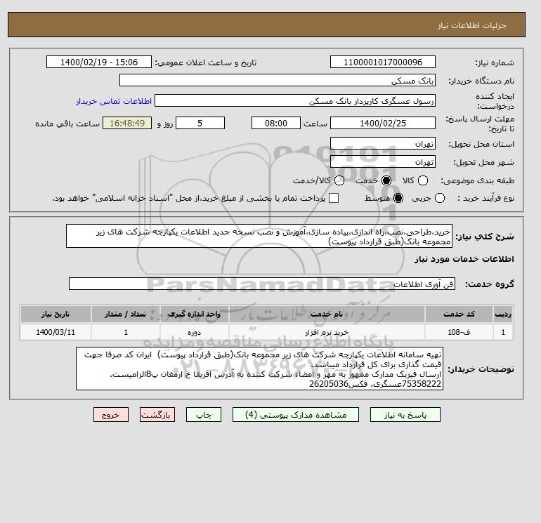 شرح کلی نیاز: خرید،طراحی،نصب،راه اندازی،پیاده سازی،آموزش و نصب نسخه جدید اطلاعات یکپارچه شرکت های زیر مجموعه بانک(طبق قرارداد پیوست)
