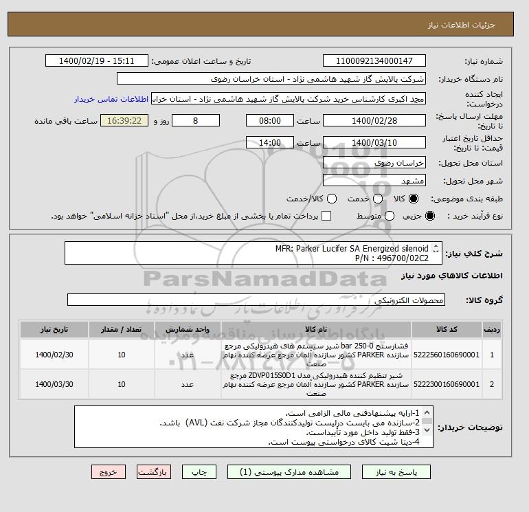 نام دستگاه خریدار:شرکت پالایش گاز شهید هاشمی نژاد - استان خراسان رضوی