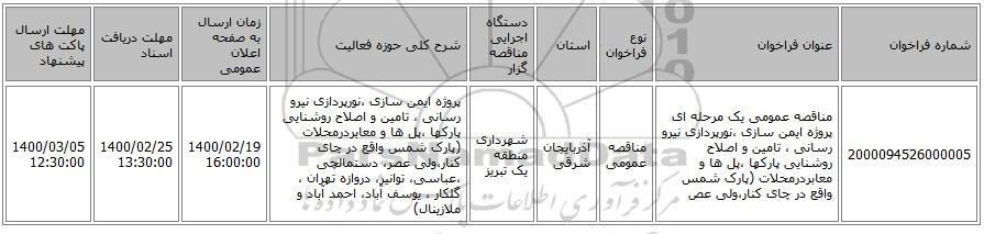 | 2000094526000005 | مناقصه عمومی یک مرحله ای پروژه ایمن سازی ،نورپردازی نیرو رسانی ، تامین و اصلاح روشنایی پارکها ،پل ها و معابردرمحلات (پارک شمس واقع در چای کنار،ولی عص | مناقصه عمومی | آذربایجان شرقی | شهرداری منطقه یک تبریز | پروژه ایمن سازی ،نورپردازی نیرو رسانی ، تامین و اصلاح روشنایی پارکها ،پل ها و معابردرمحلات (پارک شمس واقع در چای کنار،ولی عصر، دستمالچی ،عباسی، توانیر، دروازه تهران ، گلکار ، یوسف آباد، احمد آباد و ملازینال) | 1400/02/19 16:00:00 | 1400/02/25 13:30:00 | 1400/03/05 12:30:00 |