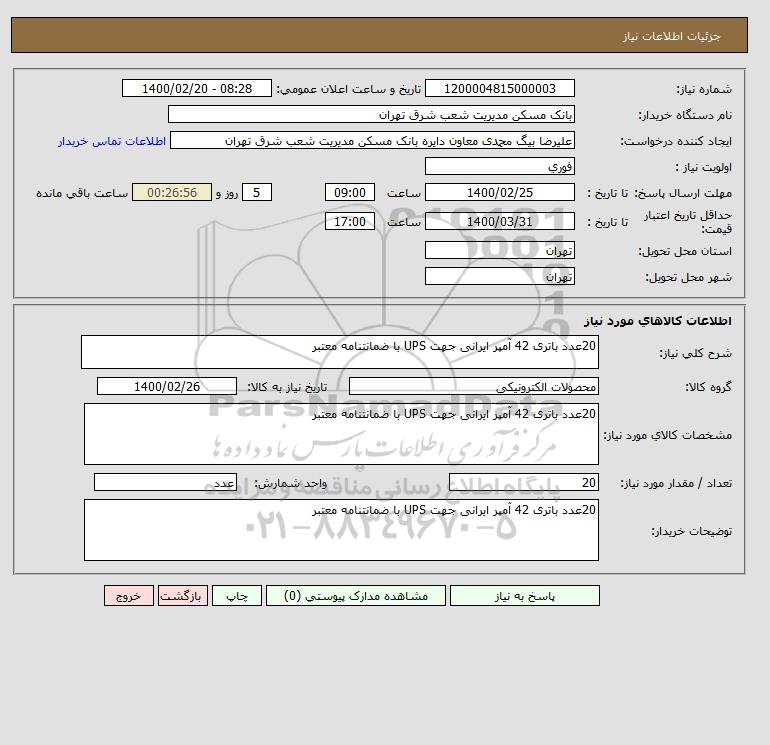 نام دستگاه خریدار:بانک مسکن مدیریت شعب شرق تهران
