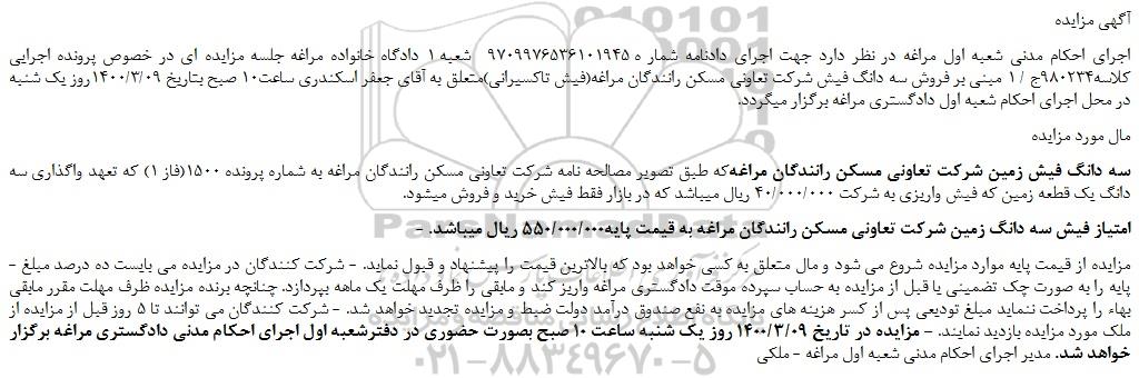 اجرای احکام مدنی شعبه اول مراغه در نظر دارد جهت اجرای دادنامه شمار ه 9709976536101945 شعبه 1 دادگاه خانواده مراغه جلسه مزایده ای در خصوص پرونده اجرایی کلاسه980234ج / 1 مبنی بر فروش سه دانگ فیش شرکت تعاونی مسکن رانندگان مراغه(فیش تاکسیرانی)متعلق به آقای جعفر اسکندری ساعت10 صبح بتاریخ 1400/3/09روز یک شنبه در محل اجرای احکام شعبه اول دادگستری مراغه برگزار میگردد.