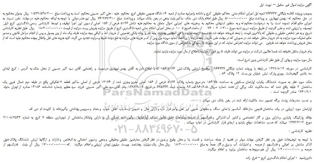 بموجب پرونده کلاسه بایگانی 966737 شعبه اول اجرای احکام مدنی محاکم حقوقی کرج و دادنامه واجراییه صادره از شعبه 16 دادگاه عمومی حقوقی کرج محکوم علیه : علی اکبر حسینی محکوم است به پرداخت مبلغ 1/539/548/200 ریال بعنوان محکوم به در حق محکوم له : بهمن نوبهاری و پرداخت مبلغ 5/000/000/000 ریال طبق اعلام بانک دی ملک مذکور بابت بدهی در رهن بانک میباشد و پرداخت مبلغ 76/977/410 ریال نیم عشر دولتی با توجه به اینکه محکوم علیه در مهلت مقرر نسبت به اجرای حکم اقدام ننموده است بنا به درخواست محکوم له و به منظور استیفای محکوم به و هزینه های اجرایی اموال متعلق به محکوم علیه شامل 5126 فرعی از 156 اصلی از سوی این اجرا توقیف و توسط کارشناس رسمی دادگستری کرج ذیل توصیف و ارزیابی شده و مقرر گردیده از طریق مزایده درروز شنبه مورخ 1400/ 2 / 26 از ساعت9صبح تا 10 در محل اجرای احکام مدنی شعبه دادگستری کرج از طریق مزایده بفروش برسد. مزایده از قیمت 18/200/000/000 ریال طبق نظریه کارشناس شروع و به هر شخص حقیقی و حقوقی که بالاترین قیمت را بدهد فروخته خواهد شد. ده درصد از وجه مزایده را فی المجلس بصورت وجه نقد یا چک بانکی تضمینی از خریدار اخذ و الباقی وجه مزایده ظرف یک ماه از وی وصول و پس از انجام مراحل قانونی و صدور حکم تملیک مورد مزایده به نام خریدار منتقل خواهد شد. در صورتی که در مهلت مقرر خریدار وجه مزایده را پرداخت ننماید سپرده وی پس از کسر هزینه های مزایده به نفع دولت ضبط و مزایده تجدید می گردد. کلیه هزینه های نقل وانتقال بعهده محکوم علیه است که از محل فروش پرداخت خواهد شد طرفین می توانند مزایده اعتراض نمایند که در این صورت تا رسیدگی به اعتراض از سوی دادگاه مورد مزایده