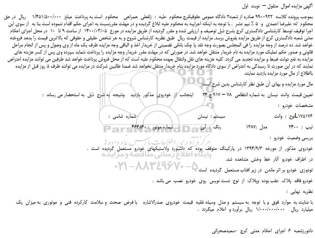 بموجب پرونده کلاسه 9900922 صادره از شعبه2 دادگاه عمومی حقوقیکرج محکوم علیه : زلفعلی همراهی محکوم است به پرداخت مبلغ 1/451/500/000 ریال در حق محکوم له: علیرضا احمدی و 5 % نیم عشر . با توجه به اینکه اجراییه به محکوم علیه ابلاغ گردیده و در مهلت مقررنسبت به اجرای حکم اقدام ننموده است بنا به از سوی این اجرا توقیف توسط کارشناسی دادگستری کرج بشرح ذیل توصیف و ارزیابی شده و مقرر گردیده از طریق مزایده در مورخ 1400/03/05 از ساعت 9 تا 10 در محل اجرای احکام مدنی شعبه دادگستری کرج از طریق مزایده بفروش برسد. مزایده از قیمت ریال طبق نظریه کارشناس شروع و به هر شخص حقیقی و حقوقی که بالاترین قیمت را بدهد فروخته خواهد شد. ده درصد از وجه مزایده را فی المجلس بصورت وجه نقد یا چک بانکی تضمینی از خریدار اخذ و الباقی وجه مزایده ظرف یک ماه از وی وصول و پس از انجام مراحل قانونی و صدور حکم تملیک مورد مزایده به نام خریدار منتقل خواهد شد. در صورتی که در مهلت مقرر خریدار وجه مزایده را پرداخت ننماید سپرده وی پس از کسر هزینه های مزایده به نفع دولت ضبط و مزایده تجدید می گردد. کلیه هزینه های نقل وانتقال بعهده محکوم علیه است که از محل فروش پرداخت خواهد شد طرفین می توانند مزایده اعتراض نمایند که در این صورت تا رسیدگی به اعتراض از سوی دادگاه مورد مزایده بنام خریدار منتقل نخواهد شد ضمنا طالبین شرکت در مزایده می توانند ظرف 5 روز قبل از مزایده بااطلاع از مال مورد مزایده بازدید نمایند.