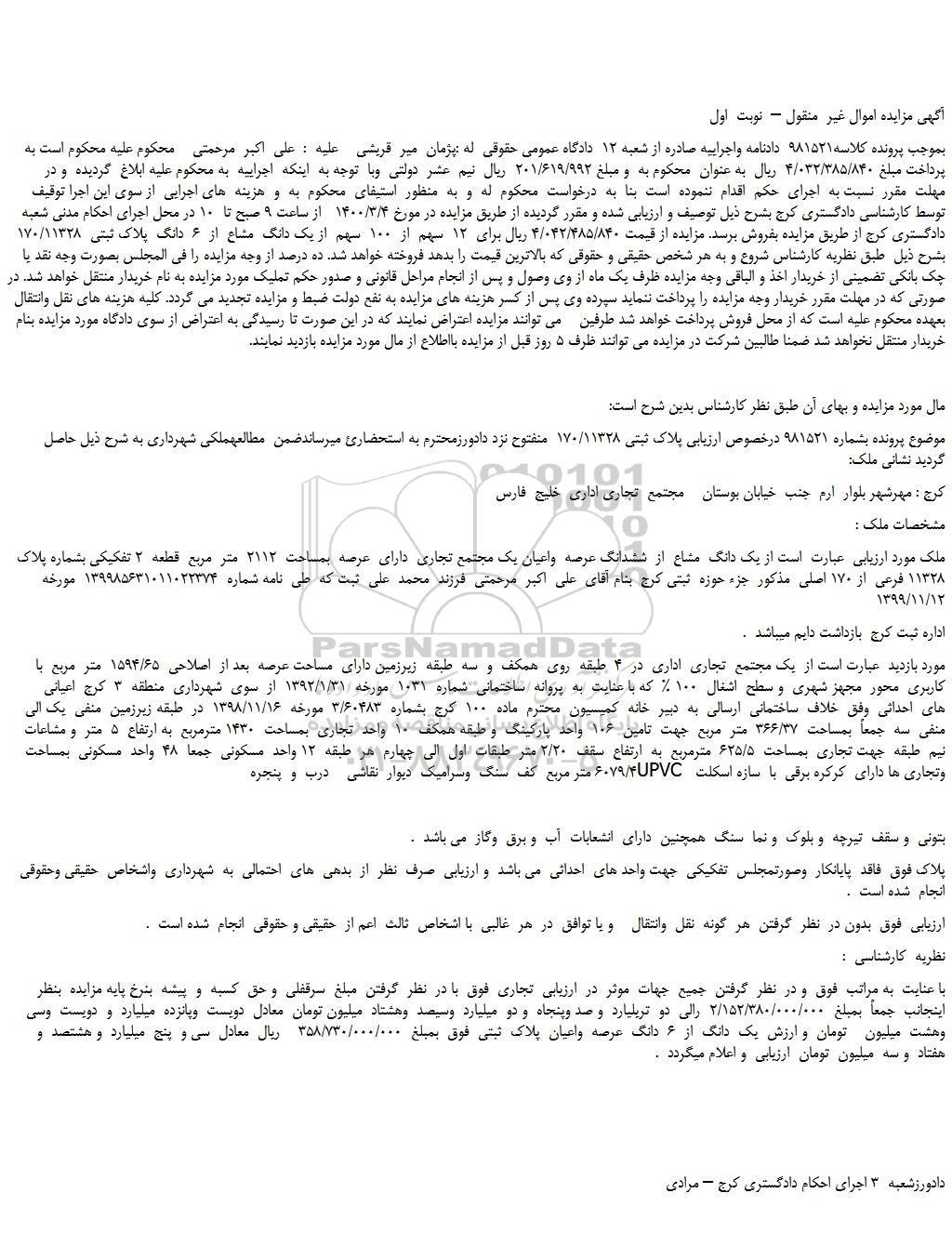 بموجب پرونده کلاسه981521 دادنامه واجراییه صادره از شعبه 12 دادگاه عمومی حقوقی له :پژمان میر قریشی علیه : علی اکبر مرحمتی محکوم علیه محکوم است به پرداخت مبلغ 4/032/385/840 ریال به عنوان محکوم به و مبلغ 201/619/992 ریال نیم عشر دولتی وبا توجه به اینکه اجراییه به محکوم علیه ابلاغ گردیده و در مهلت مقرر نسبت به اجرای حکم اقدام ننموده است بنا به درخواست محکوم له و به منظور استیفای محکوم به و هزینه های اجرایی از سوی این اجرا توقیف توسط کارشناسی دادگستری کرج بشرح ذیل توصیف و ارزیابی شده و مقرر گردیده از طریق مزایده در مورخ 1400/3/4 از ساعت 9 صبح تا 10 در محل اجرای احکام مدنی شعبه دادگستری کرج از طریق مزایده بفروش برسد. مزایده از قیمت 4/042/485/840 ریال برای 12 سهم از 100 سهم از یک دانگ مشاع از 6 دانگ پلاک ثبتی 170/11328 بشرح ذیل طبق نظریه کارشناس شروع و به هر شخص حقیقی و حقوقی که بالاترین قیمت را بدهد فروخته خواهد شد. ده درصد از وجه مزایده را فی المجلس بصورت وجه نقد یا چک بانکی تضمینی از خریدار اخذ و الباقی وجه مزایده ظرف یک ماه از وی وصول و پس از انجام مراحل قانونی و صدور حکم تملیک مورد مزایده به نام خریدار منتقل خواهد شد. در صورتی که در مهلت مقرر خریدار وجه مزایده را پرداخت ننماید سپرده وی پس از کسر هزینه های مزایده به نفع دولت ضبط و مزایده تجدید می گردد. کلیه هزینه های نقل وانتقال بعهده محکوم علیه است که از محل فروش پرداخت خواهد شد طرفین می توانند مزایده اعتراض نمایند که در این صورت تا رسیدگی به اعتراض از سوی دادگاه مورد مزایده بنام خریدار منتقل نخواهد شد ضمنا طالبین شرکت در مزایده می توانند ظرف 5 روز قبل از مزایده بااطلاع از مال مورد مزایده بازدید نمایند.