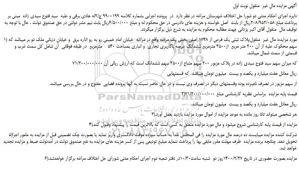 آگهی مزایده مال غیر منقول نوبت اول