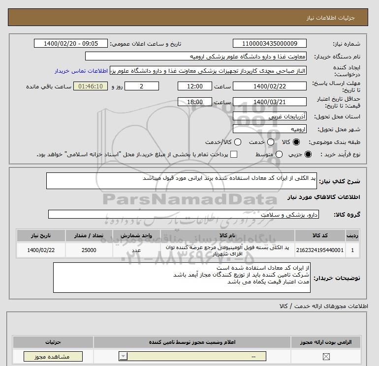 شرح کلی نیاز: پد الکلی از ایران کد معادل استفاده شده برند ایرانی مورد قبول میباشد