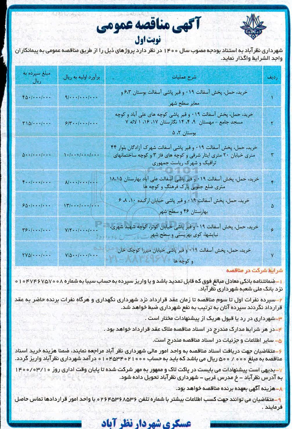 شهرداری نظرآباد به استناد بودجه مصوب سال 1400 در نظر دارد پروژه های ذیل را از طریق مناقصه عمومی به پیمانکاران واجدالشرایط واگذار نماید.