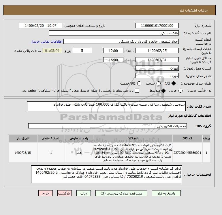 استعلام سرویس شخصی سازی ، بسته بندی و پاکت گذاری 100.000 عدد کارت بانکی طبق قرارداد, استعلام سرویس شخصی سازی ، بسته بندی و پاکت گذاری 100.000 عدد کارت بانکی طبق قرارداد