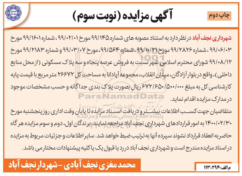 مزایده فروش عرصه پنجاه و سه پلاک مسکونی نوبت سوم چاپ دوم