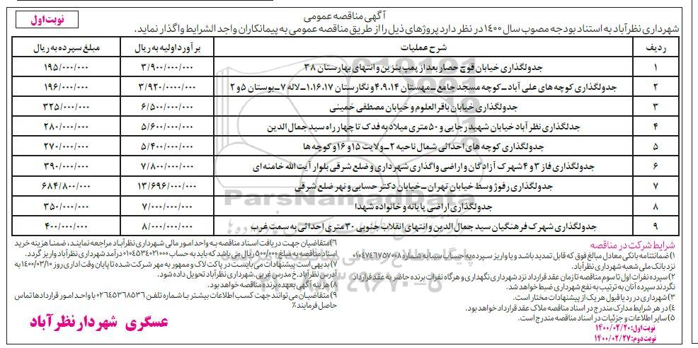 شهرداری نظرآباد به استناد بودجه مصوب سال 1400 در نظر دارد پروژه های ذیل را از طریق مناقصه عمومی به پیمانکاران واجدالشرایط واگذار نماید.