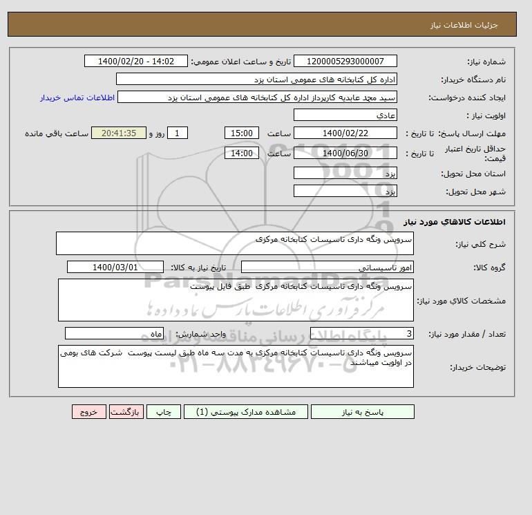 مشخصات کالای مورد نیاز: سرویس ونگه داری تاسیسات کتابخانه مرکزی طبق فایل پیوست