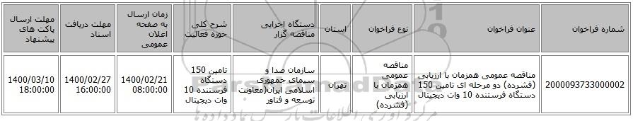 | 2000093733000002 | مناقصه عمومی همزمان با ارزیابی (فشرده) دو مرحله ای تامین 150 دستگاه فرستنده 10 وات دیجیتال | مناقصه عمومی همزمان با ارزیابی (فشرده) | تهران | سازمان صدا و سیمای جمهوری اسلامی ایران(معاونت توسعه و فناور | تامین 150 دستگاه فرستنده 10 وات دیجیتال | 1400/02/21 08:00:00 | 1400/02/27 16:00:00 | 1400/03/10 18:00:00 |