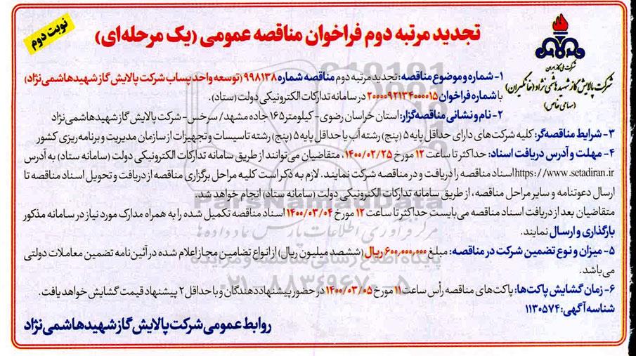 1- شماره و موضوع مناقصه: تجدید مرتبه دوم مناقصه شماره 998138 توسعه واحد پساب شرکت پالایش گاز شهید هاشمی نژاد با شماره فراخوان 2000092134000015 در سامانه تدارکات الکترونیکی دولت ستاد
