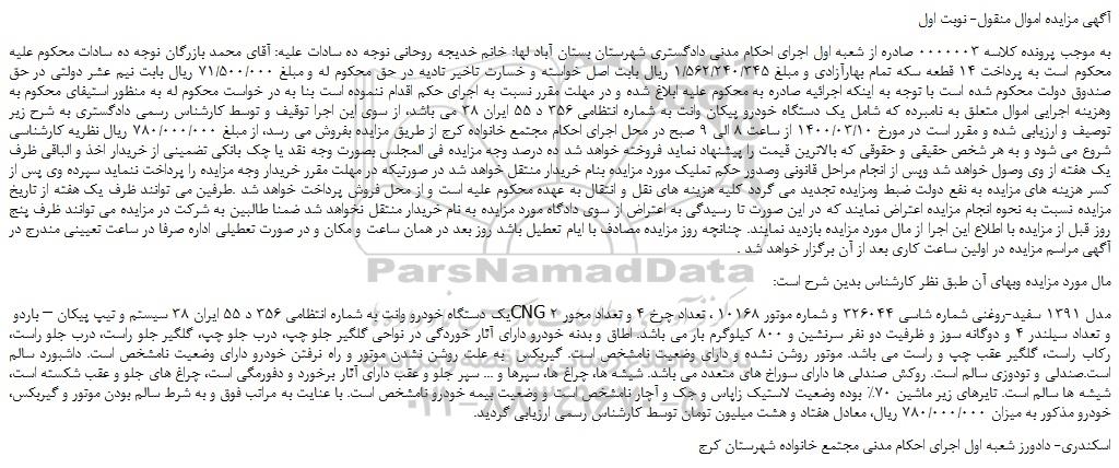 به موجب پرونده کلاسه 0000003 صادره از شعبه اول اجرای احکام مدنی دادگستری شهرستان بستان آباد لها: خانم خدیجه روحانی نوجه ده سادات علیه: آقای محمد بازرگان نوجه ده سادات محکوم علیه محکوم است به پرداخت 14 قطعه سکه تمام بهارآزادی و مبلغ 1/562/240/345 ریال بابت اصل خواسته و خسارت تاخیر تادیه در حق محکوم له و مبلغ 71/500/000 ریال بابت نیم عشر دولتی در حق صندوق دولت محکوم شده است با توجه به اینکه اجرائیه صادره به محکوم علیه ابلاغ شده و در مهلت مقرر نسبت به اجرای حکم اقدام ننموده است بنا به در خواست محکوم له به منظور استیفای محکوم به وهزینه اجرایی اموال متعلق به نامبرده که شامل یک دستگاه خودرو پیکان وانت به شماره انتظامی 356 د 55 ایران 38 می باشد، از سوی این اجرا توقیف و توسط کارشناس رسمی دادگستری به شرح زیر توصیف و ارزیابی شده و مقرر است در مورخ 1400/03/10 از ساعت 8 الی 9 صبح در محل اجرای احکام مجتمع خانواده کرج از طریق مزایده بفروش می رسد، از مبلغ 780/000/000 ریال نظریه کارشناسی شروع می شود و به هر شخص حقیقی و حقوقی که بالاترین قیمت را پیشنهاد نماید فروخته خواهد شد ده درصد وجه مزایده فی المجلس بصورت وجه نقد یا چک بانکی تضمینی از خریدار اخذ و الباقی ظرف یک هفته از وی وصول خواهد شد وپس از انجام مراحل قانونی وصدور حکم تملیک مورد مزایده بنام خریدار منتقل خواهد شد در صورتیکه در مهلت مقرر خریدار وجه مزایده را پرداخت ننماید سپرده وی پس از کسر هزینه های مزایده به نفع دولت ضبط ومزایده تجدید می گردد کلیه هزینه های نقل و انتقال به عهده محکوم علیه است و از محل فروش پرداخت خواهد شد .طرفین می توانند ظرف یک هفته از تاریخ مزایده نسبت به نحوه انجام مزایده اعتراض نمایند که در این صورت تا رسیدگی به اعتراض از سوی دادگاه مورد مزایده به نام خریدار منتقل نخواهد شد ضمنا طالبین به شرکت در مزایده می توانند ظرف پنج روز قبل از مزایده با اطلاع این اجرا از مال مورد مزایده بازدید نمایند. چنانچه روز مزایده مصادف با ایام تعطیل باشد روز بعد در همان ساعت و مکان و در صورت تعطیلی اداره صرفا در ساعت تعیینی مندرج در آگهی مراسم مزایده در اولین ساعت کاری بعد از آن برگزار خواهد شد .