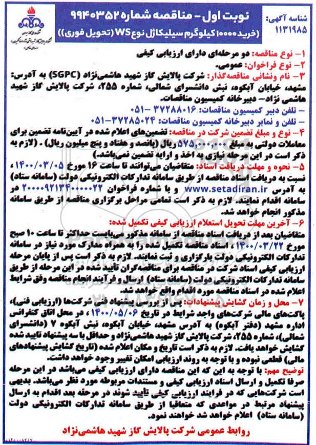 مناقصه خرید 10000 کیلوگرم سیلیکاژل نوع WS از کلیه افراد متخصص و شرکتها واجد شرایط دعوت به عمل میآید در مناقصه با کد خبرگزاری پارس نماد: 3403163 شرکت نمایند.