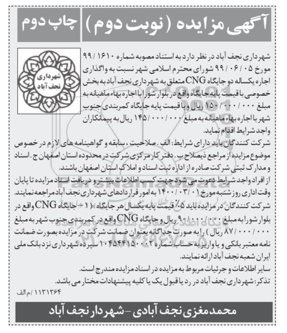 شهرداری نجف آباد در نظر دارد به استناد مصوبه شماره 99/1610 مورخ 99.6.5 شورای محترم اسلامی شهر نسبت به واگذاری اجاره یکساله دو جایگاه CNG متعلق به شهرداری نجف آباد به بخش خصوصی با قیمت پایه جایگاه واقع در بلوار شورا با اجاره بها ماهیانه به مبلغ 150.000.000 ریال و قیمت پایه جایگاه کمربندی جنوب شهر با اجاره بها ماهیانه به مبلغ 145.000.000 ریال به پیمانکاران واجد شرایط اقدام نماید .