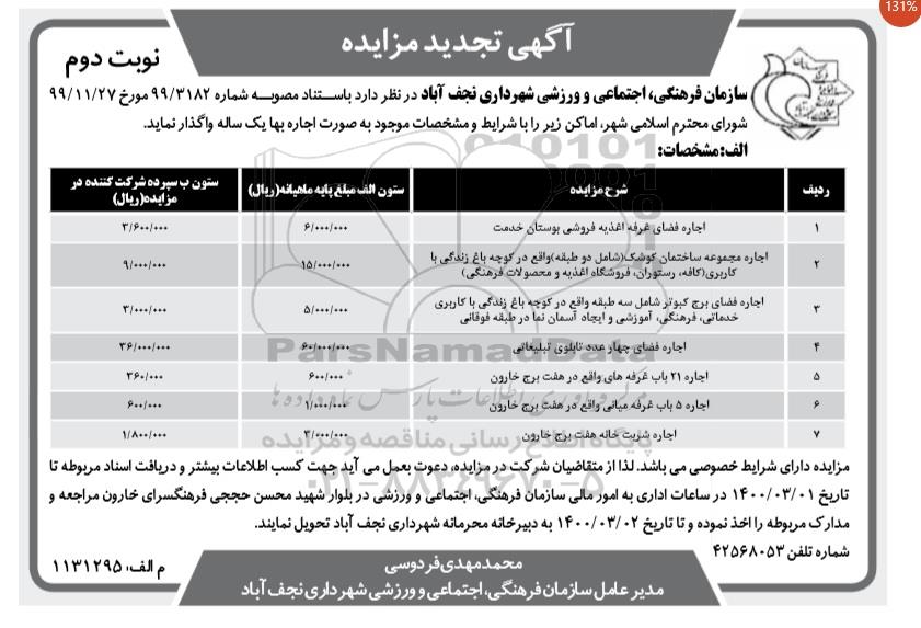 سازمان فرهنگی، اجتماعی و ورزشی شهرداری نجف آباد در نظر دارد باستناد مصوبه شماره 99/3182 مورخ 99.11.27 شورای اسلامی شهر، اماکن زیر را با شرایط و مشخصات موجود به صورت اجاره بها یک ساله واگذار نماید .