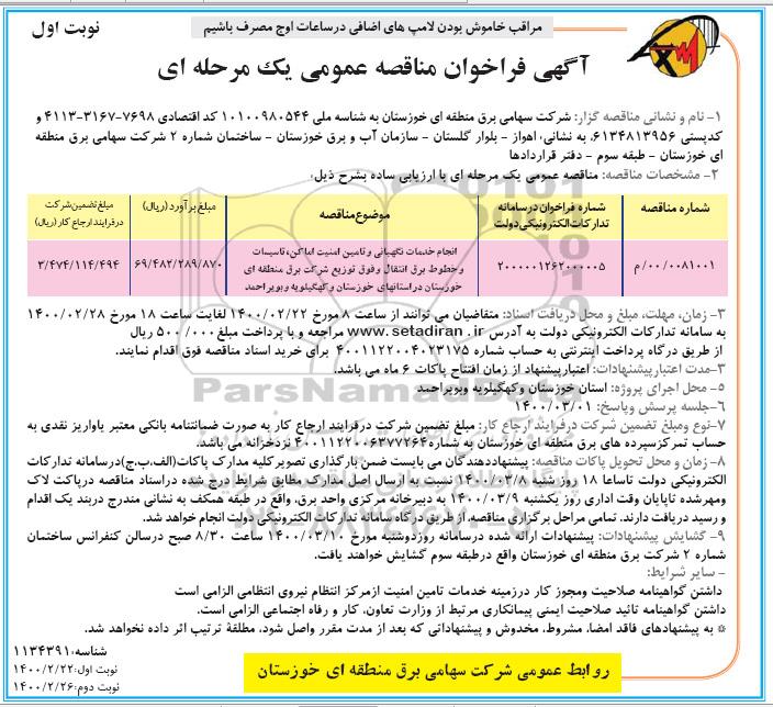 | م/00/0081001 | 2000001262000005 | انجام خدمات نگهبانی و تامین امنیت اماکن، تاسیسات و خطوط برق انتقال و فوق توزیع شرکت برق منطقه ای خوزستان در استان های خوزستان و کهگیلویه و بویراحمد | 69.482.289.870 | 3.474.114.494 |