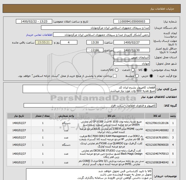شرح کلی نیاز: قطعات کامپیوتر بشرح ایران کد