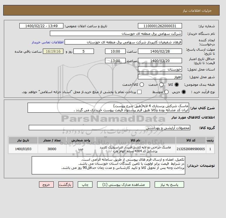 شرح کلی نیاز: ماسک شرکتی پرستاری 4 لایه(طبق شرح پیوست)